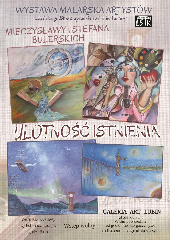 Od 20 listopada do 9 grudnia 2025 r. w Galerii Art Lubin przy ul. Składowej 3, będzie można podziwiać dorobek artystyczny dwojga cenionych malarzy: Mieczysławy i Stefana Bulerskich, artystów z Lubińskiego Stowarzyszenia Twórców Kultury. Ekspozycja "Ulotność istnienia" obejmuje malarstwo olejne, akrylowe oraz techniki mieszane ...